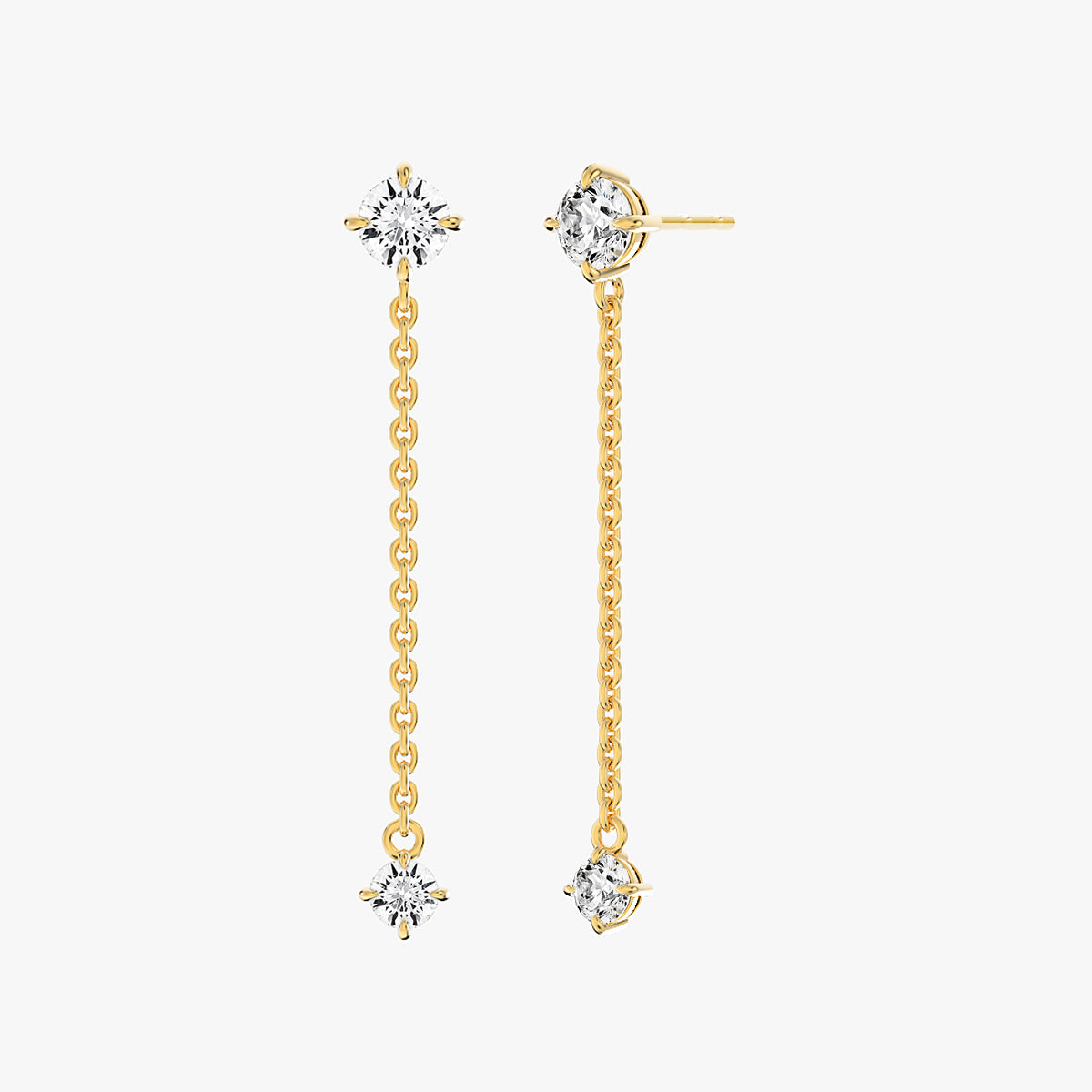 14k 옐로우 골드 듀오 드롭 이어링 두 개의 라운드 브릴리언트 다이아몬드가 모던하면서도 우아하며, 미니멀함과 동시에 섬세하게 세팅되어 있습니다.