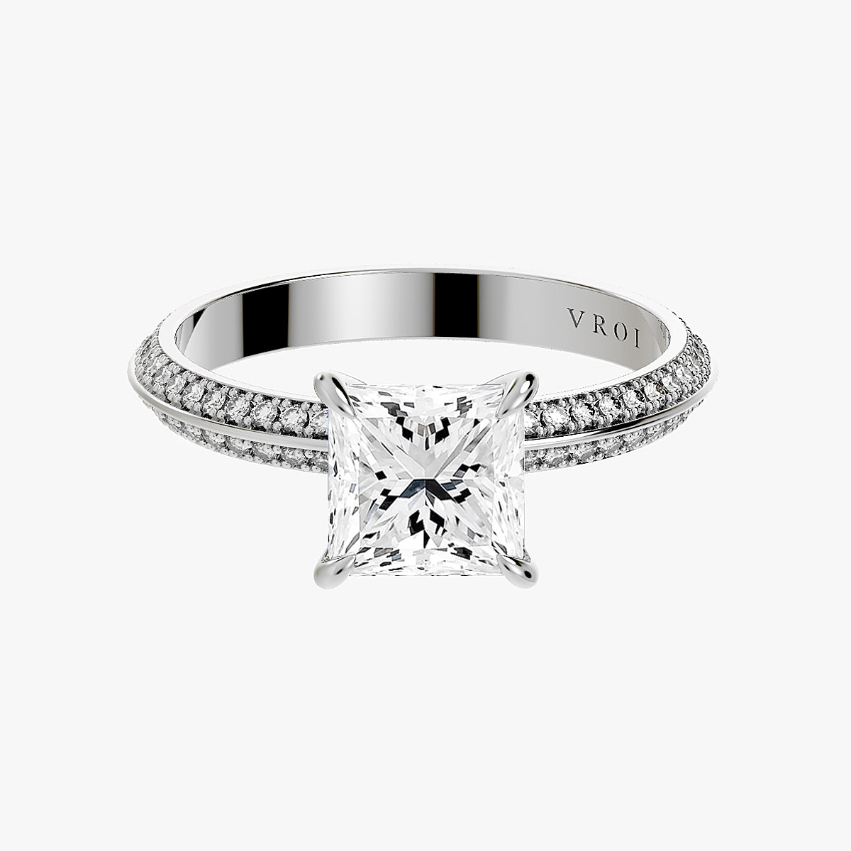14k 화이트 골드 소재에 프린세스 컷 다이아몬드가 세팅된 VROI 시그니처 파베 약혼 링.
