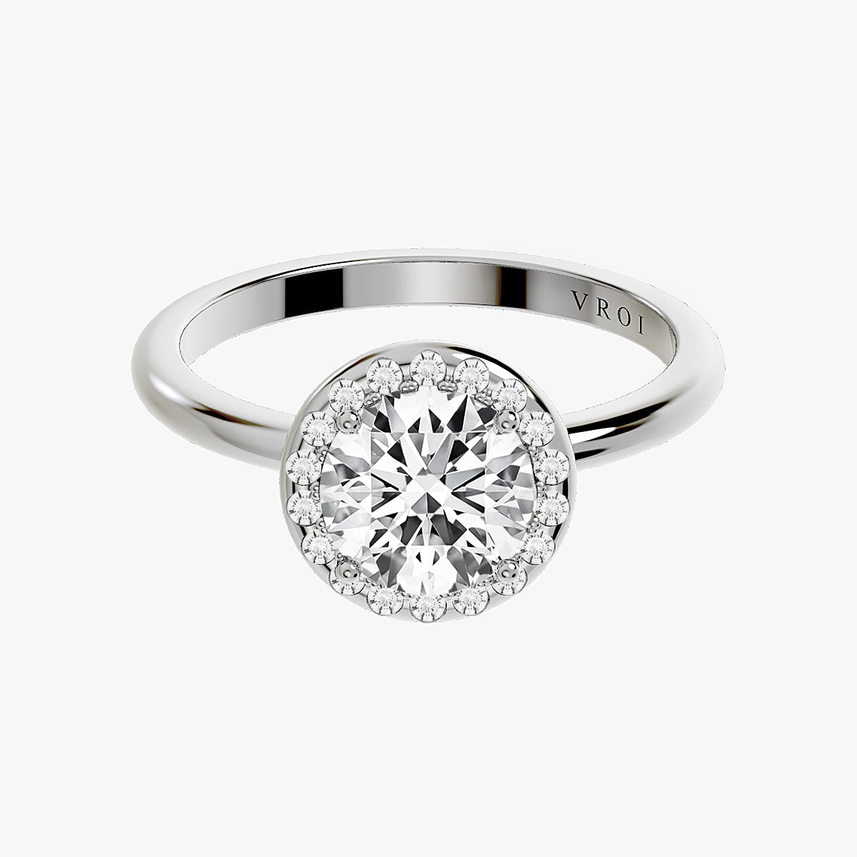 헤일로 약혼 반지는 고전적인 로맨틱한 분위기를 표현한 것입니다. 개별적으로 파베 세팅된 빛나는 다이아몬드 시리즈는 메인 스톤의 광채를 강조합니다. VROI의 시그니처 슬링은 밴드 아래로 약간 내려가 빛을 끌어당겨 다이아몬드가 더욱 밝게 빛납니다.